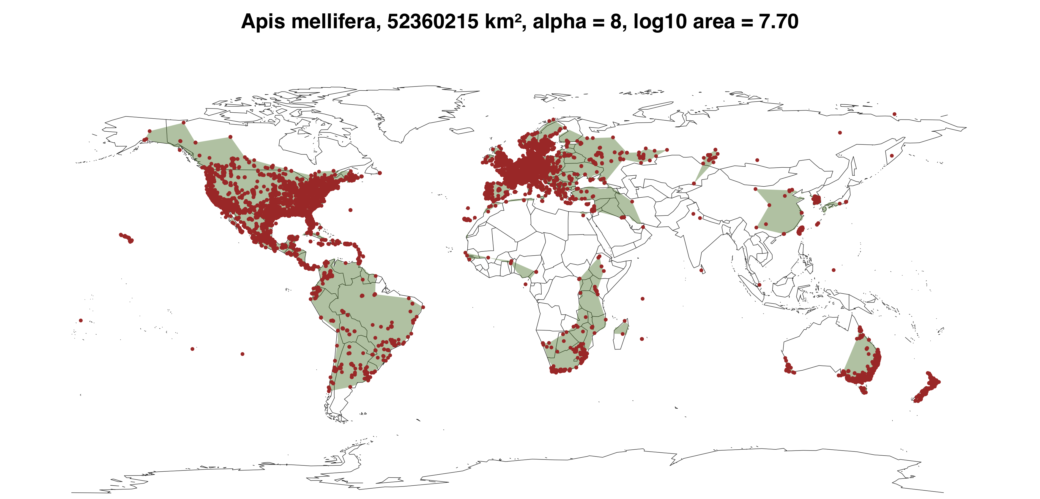 Next, I need to estimate range size. A common approach is to use occurrence data —records of the latitude and longitude of where animals were observed— to infer the range. Using the Global Biodiversity Information Facility database, I downloaded occurrence data for the animals species I had genetic diversity and population density estimates for. I then wrote some R code to automatically infer the ranges from this occurrence data.