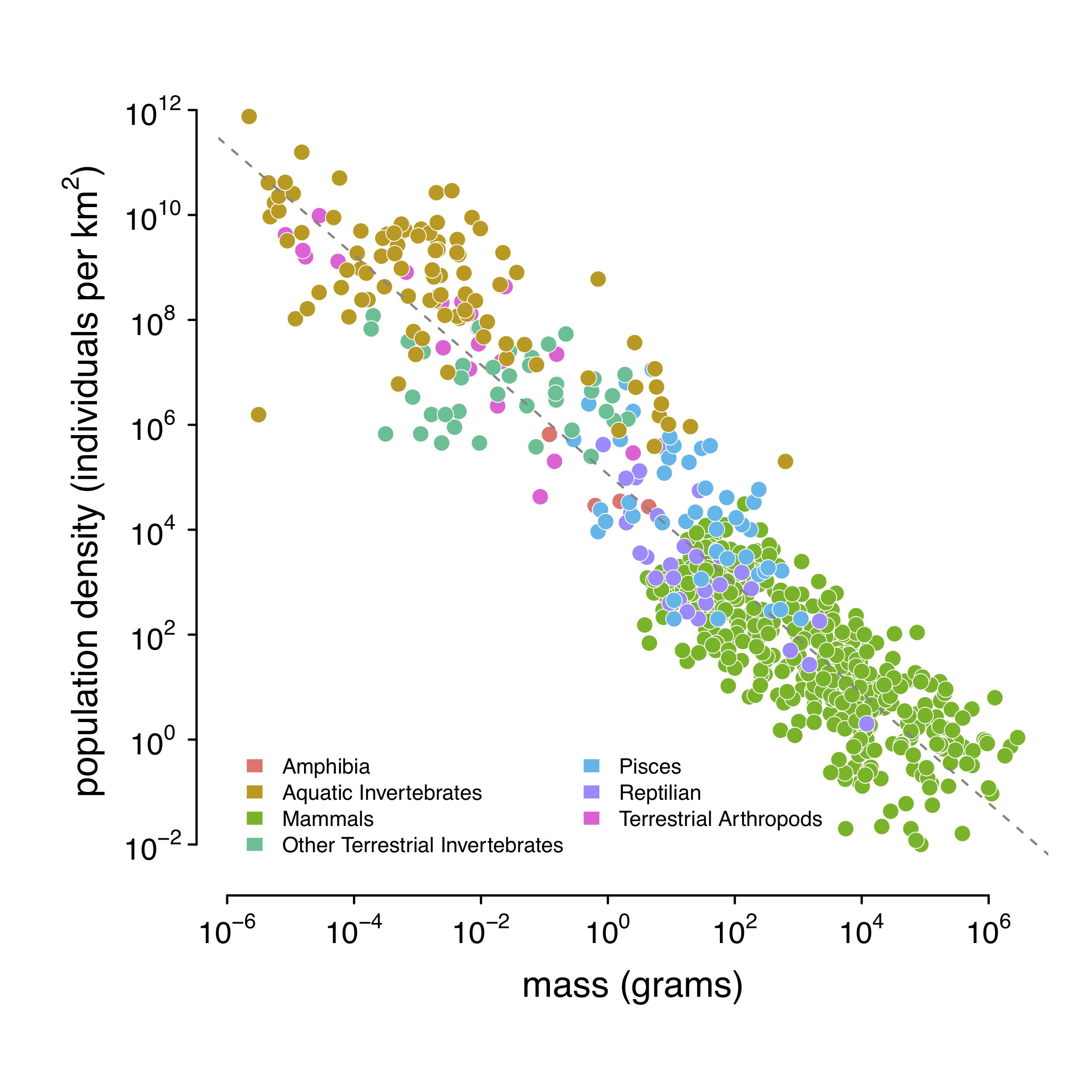 Luckily, the field of macroecology provides a way out. As mentioned, animals have energetic needs that scale with their body sizes. Large-bodied animals require more energy that they procure by hunting or grazing a certain area; competition between individuals for such resources means that large-bodied animals can only live at lower densities. The shocking result is that population densities are surprisingly well correlated with body mass. Damuth (1981, 1987) quantified this; here is a figure from my paper (Figure 1–figure supplement 1 ):