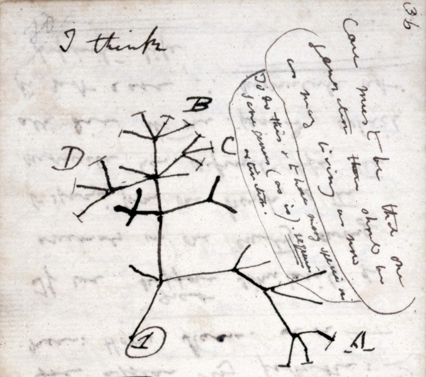 We might look at the relationship above and conclude that there is a significant relationship between population sizes and genetic diversity. Unfortunately, there’s a statistical conundrum that crops up whenever we draw lines of best fit through data points like species. Species are connected by an underlying phylogenetic tree; certain species share common ancestors more recently than others. This was one of Darwin’s brilliant ideas, sketched out in 1837 in his notebook (figure above). In a seminal article in 1985, Joe Felsenstein pointed out that the underlying species tree creates a statistical problem whenever we want to make comparisons across species (as I’m doing here), and this statistical issue should be accounted for.