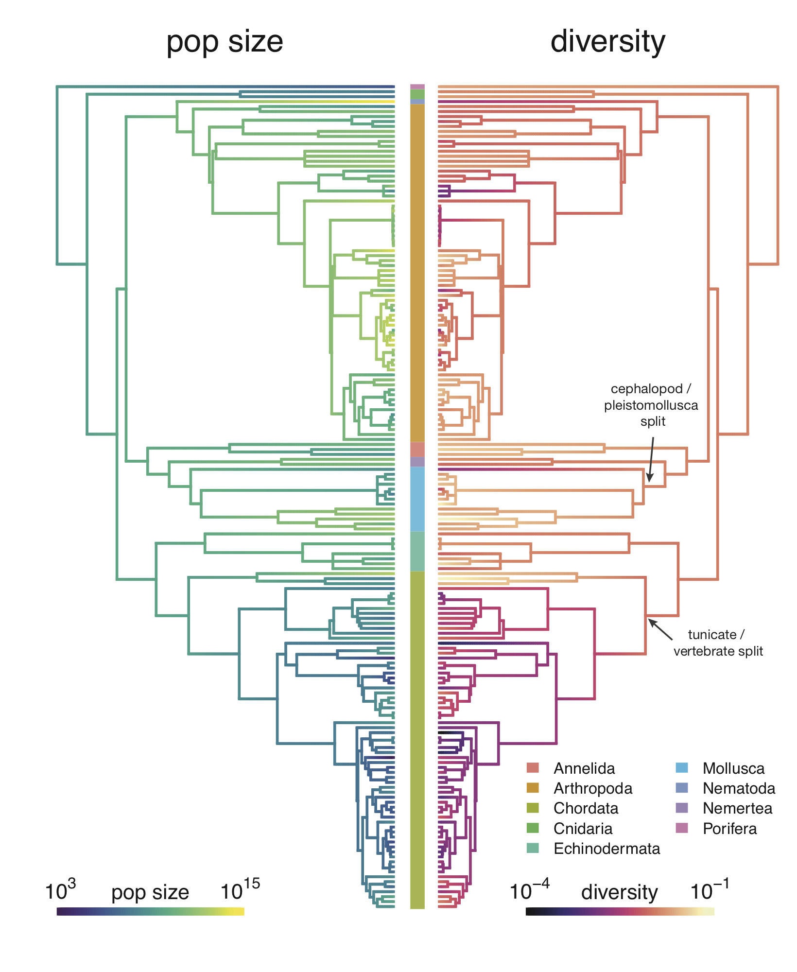 Technological improvements in genome sequencing revolutionized population genomics, and have provided evidence that diversity within species is shaped by a mix of past demographic events, such as bottlenecks, as well as by natural selection. Lewontin’s Paradox, however, remains unresolved through the genomics era. There are a few nice pieces of recent work that set up some context for my recent paper. The first of which was Ellen Leffler et al. (2012) , which compiled estimates of diversity from genomic data. This was one of the first papers I read as I grew interested in population genomics, and certainly inspired me to continue in the field. In this paper, Leffler and colleagues survey diversity for 167 species, and find an 800-fold difference between the highest diversity species (the sea squirt Ciona savignyi) to the lowest diversity species (the wild cat, Lynx lynx). Overall, they point out the narrow range of diversity is still an open and important mystery.
