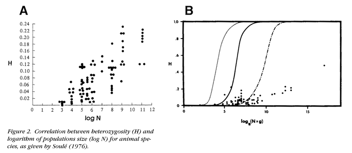 The first component of my paper was to try to actually estimate the population sizes across various animal species, and quantify the relationship between genetic diversity and population size. Early work from Soulé (1976), Frankham (1996), and Nei and Graur (1984) has looked at this relationship before, using early protein heterozygosity data: