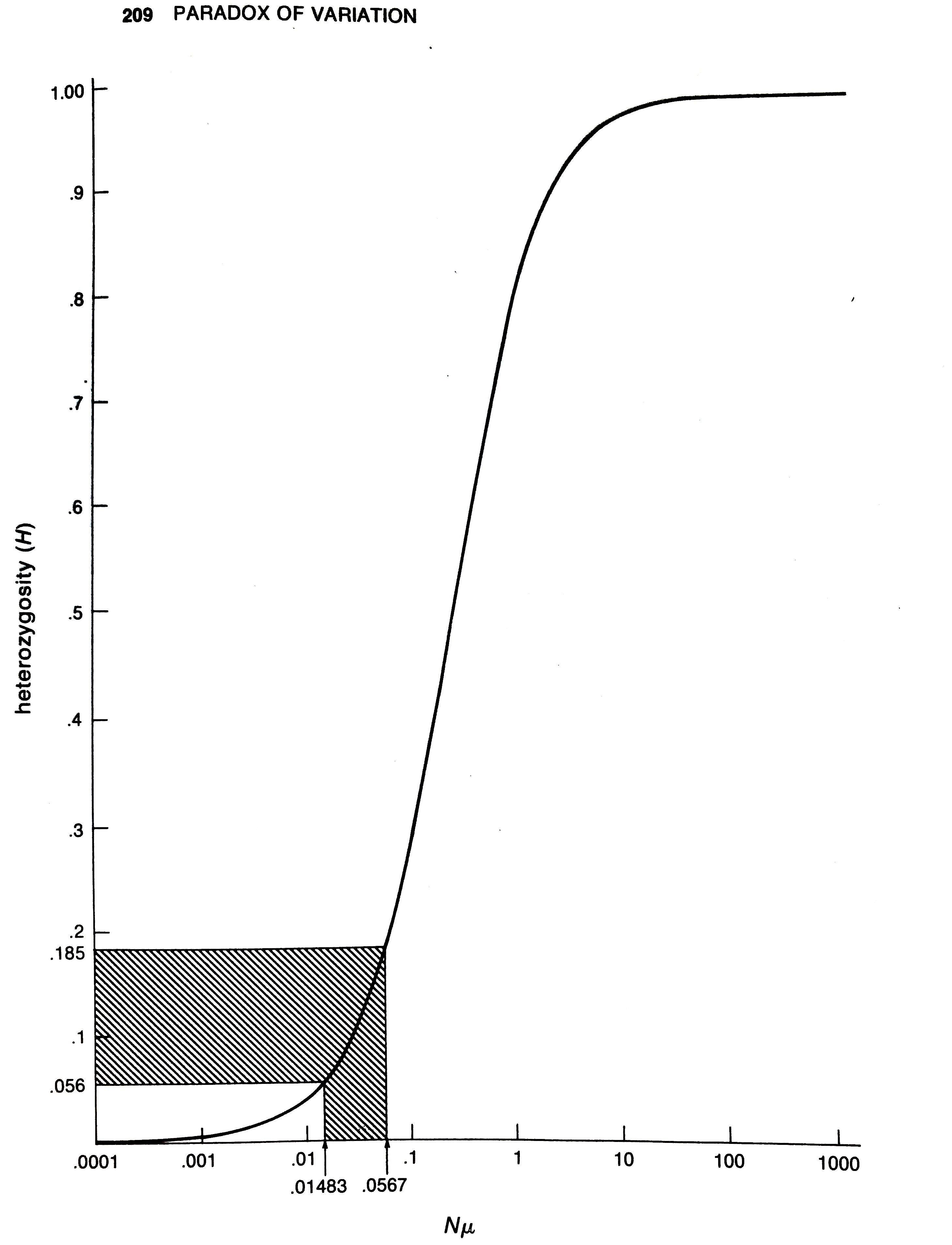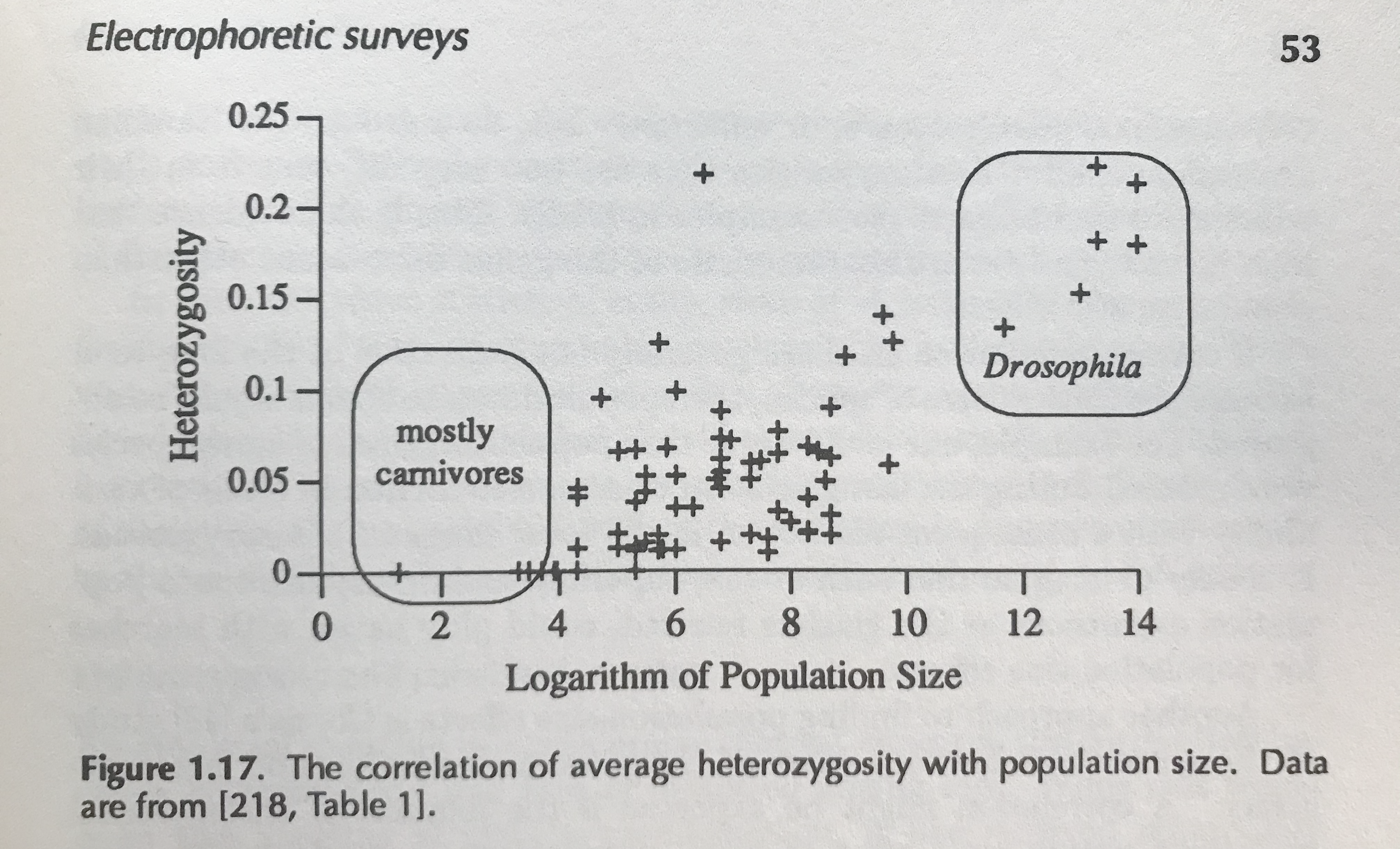 The observed range of heterozygosities over all the species […] lies in the sensitive region, between 0.056 and 0.184. This range corresponds to values of $N\mu$ between 0.015 and 0.057. Since there is no reason to suppose that mutation rate has been specially adjusted in evolution to be the reciprocal of population size for higher organisms, we are required to believe that higher organisms including man, mouse, and Drosophila and the horseshoe crab all have population sizes within a factor of 4 of each other. […] The patent absurdity of such a proposition is strong evidence against a neutralist explanation of observed heterozygosity.