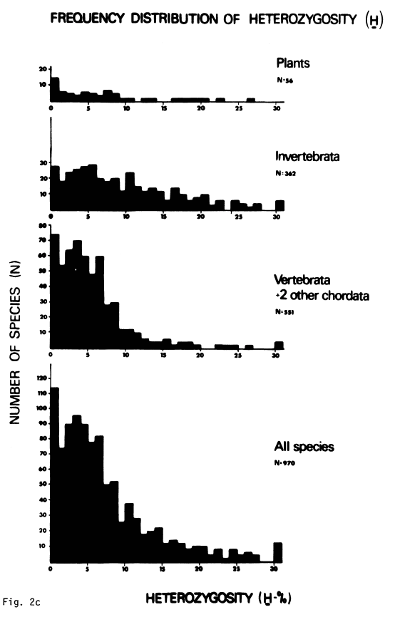 While Lewontin’s estimated range of heterozygosities only included 13 species (Table 22, p. 117), this problem wasn’t just an artifact of small sample size. Throughout the 1970s, estimating protein heterozygosities with gel electrophoresis became a cottage industry. In the decade since Lewontin’s book, over a thousand species had published estimates of their protein variability, which confirmed the narrow range of genetic variability found by Lewontin. Nevo and colleagues published a survey of estimates of protein heterozygosities for 1,111 different species, finding that heterozygosity ranges only from 0% to 30%:5